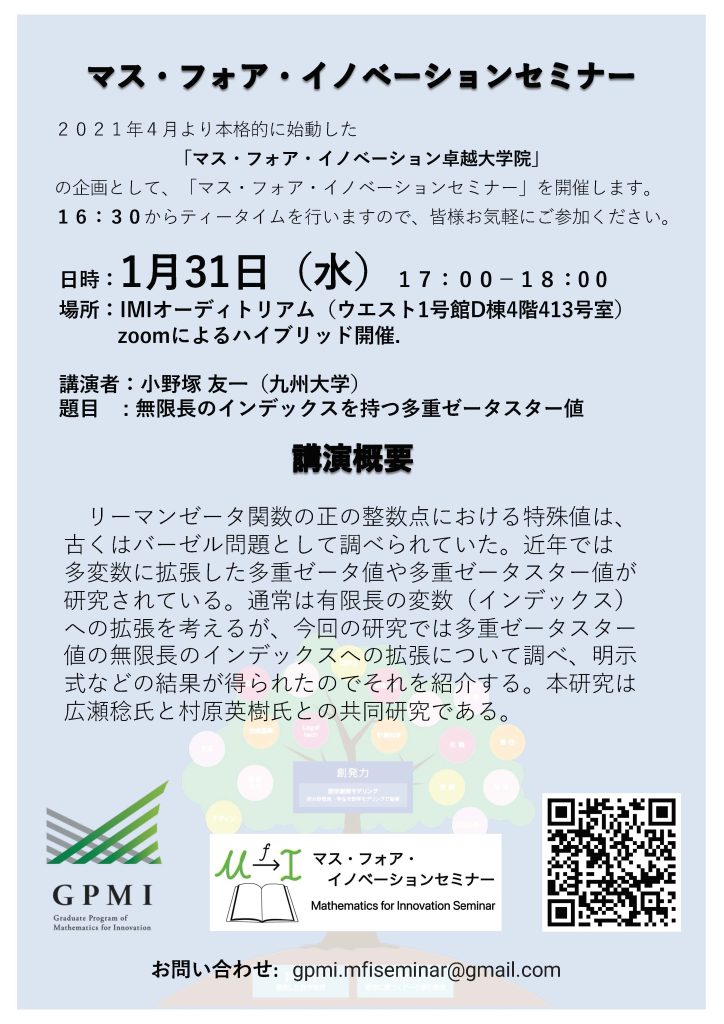 | 講演 | 講演者:小野塚友一(九州大学 学術研究員) 講演タイトル:無限長のインデックスを持つ多重ゼータスター値 |